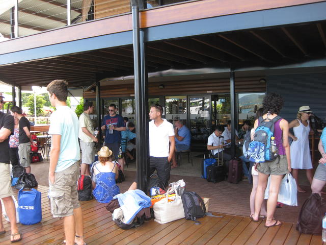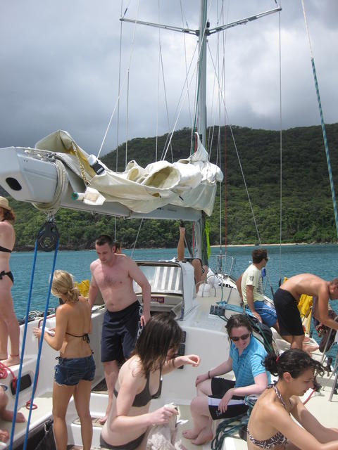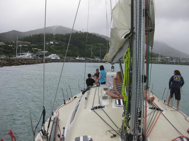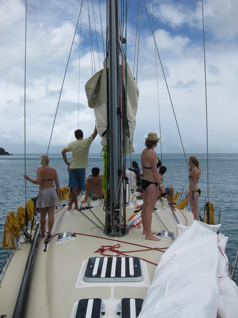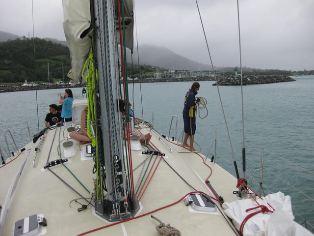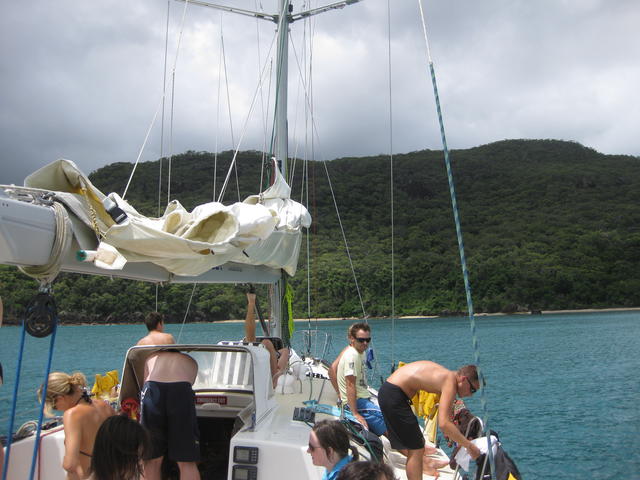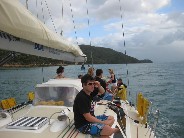 wie ich ja schon im letzten Post verraten habe, hat mir das Segeln auf den Whitsunday Islands riesig Spaß gemacht. Es war das beste Erlebnis bisher hier in Australien. Ich hatte aber auch verdammt viel Glück. In den drei Tagen hat es wenig geregnet, wir hatten viel Wind und schöne hohe Wellen, eine sehr nette Gruppe und einen klasse Skipper, der wirklich was von Segeln versteht. Leider habe ich bei den Bildern keine wo wir richtig segeln. Für den Foto war es zu nass, zu windig und zu gefährlich 😉 Deshalb konnte ich immer nur in den Pausen Bilder schießen. Ich kriege aber noch Segel-Bilder von ein paar Leuten aus der Gruppe zugeschickt. Sobald ich die habe, reiche ich sie nach. Ihr müsst einfach sehen, wie sehr sich das Schiff unter der Kraft des Windes zu Seite neigt und dabei die Wellen alle voll spritzen.