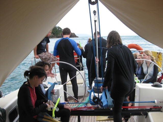 Neben dem Segeln waren wir auch ein drei mal an verschiedenen Riffen Schnorcheln. Leider hat man wegen dem vielen Regen (ja, es ist immer noch Regenzeit hier) nicht sehr weit gesehen (2-3m). Für die Riffe und ein paar bunte Fische hat es aber gereicht. Einer aus unserer Gruppe hat sogar einen kleinen Riffhai (1,2m) gesehen. Ich bin ganz froh, dass ich bisher noch keine Bekanntschaft mit den Raubfischen gemacht habe. Gegen die Stinger-Quallen und verschiedene andere giftige Viecher mussten wir immer Stinger-Suits anhaben, wenn wir ins Wasser gehen wollten. Das war etwas nervig, aber Sicherheit geht vor.